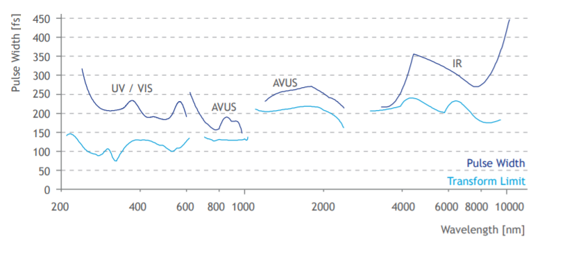 典型脈沖寬度(假設(shè) sech2 脈沖形狀)及其相應(yīng)的 AVUS 變換限制,包括擴(kuò)展(用 40 μJ 泵浦激光器以 1 MHz 重復(fù)率泵浦)