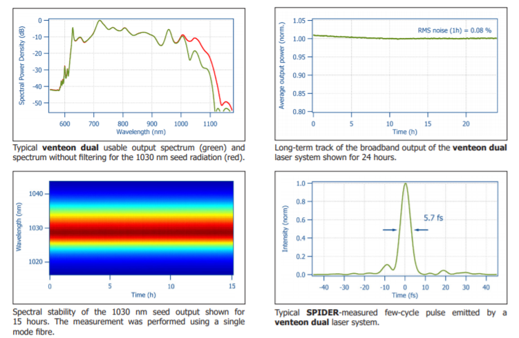 venteon 雙激光系統(tǒng)代表了寬帶少周期 OPCPA 應(yīng)用的理想前端。該激光器的光譜帶寬允許生成低于 5.5 fs 的寬帶脈沖作為 NOPA 級(jí)的信號(hào),并額外提供足夠的脈沖能量來(lái)為基于 Yb 的放大器泵級(jí)提供種子。脈沖由兩個(gè)獨(dú)立的輸出端口提供,并且本質(zhì)上與超低定時(shí)抖動(dòng)自同步。