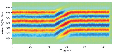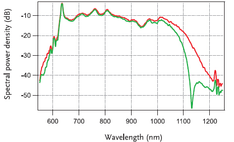 紅色為無過濾CEP穩(wěn)定激光輸出光譜,綠色為可用CEP穩(wěn)定輸出光譜。 |