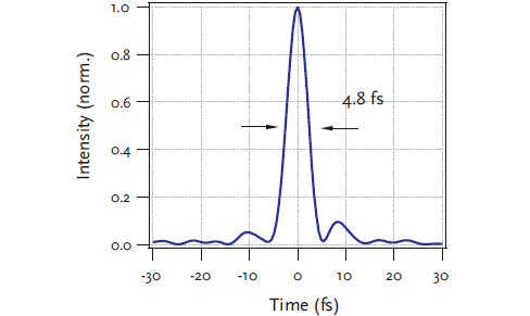 典型的幾個(gè)周期脈沖,脈寬為4.8fs (SPIDER實(shí)測)。 |