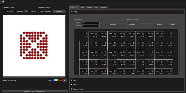 通過我們提供的軟件,可以動態(tài)選擇圖形圖案的形貌(單點的出光與否),而且可以通過控制單點的出光與否控制光束間距。通過軟件可以控制單點能量。如下兩圖所示: